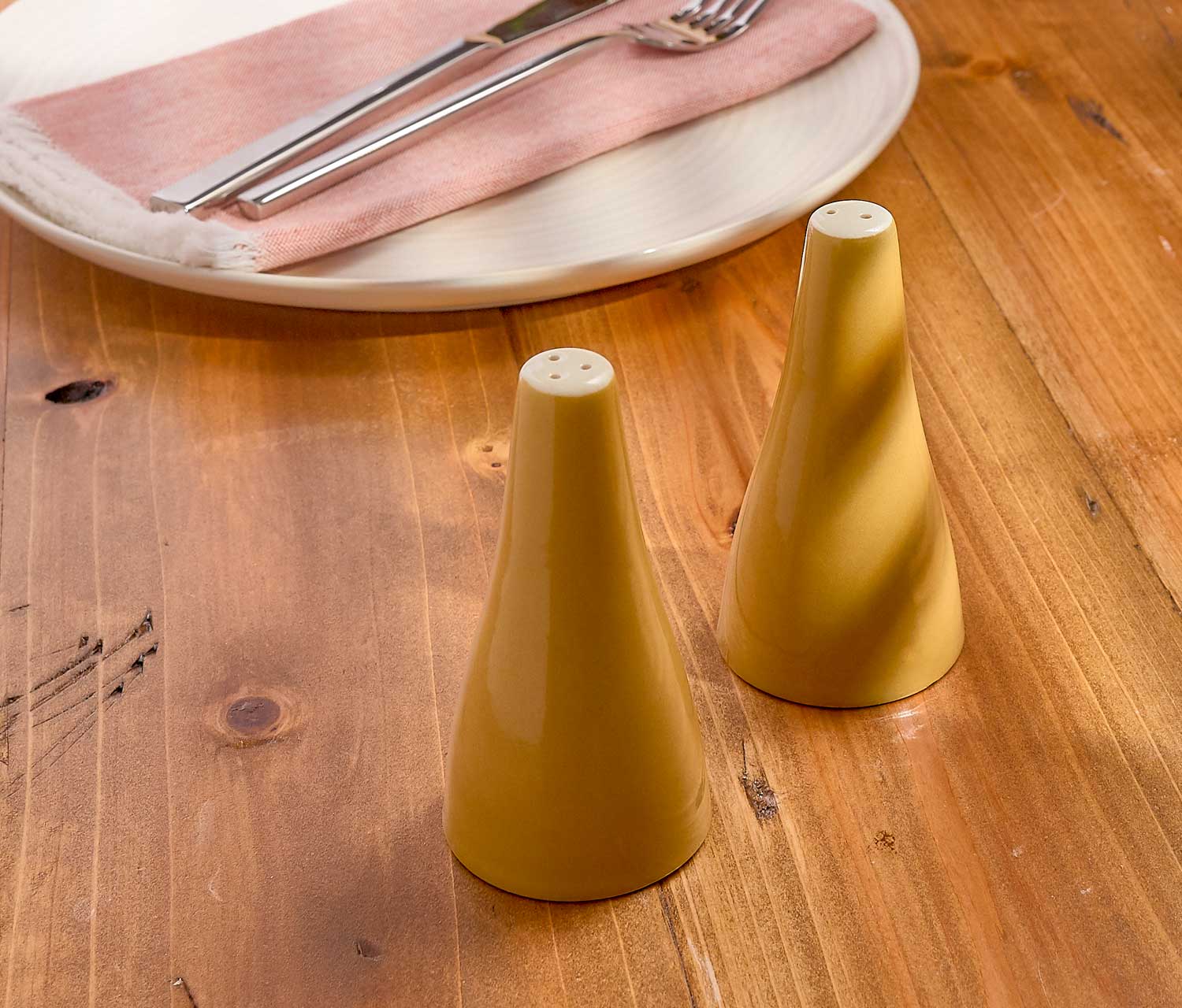 Create a Mid-Century modern vibe for your table with this vintage small Mikasa stoneware salt & pepper shaker set in a beautiful golden sand hue.