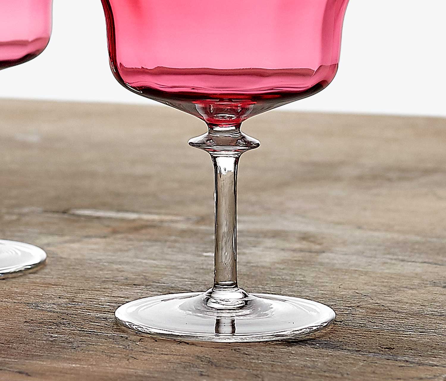Bring a splash of retro glam and rosy flair to your happy hour with this charming set of 2 or 4 vintage cranberry/magenta and clear stem coupe/sherbet glasses.