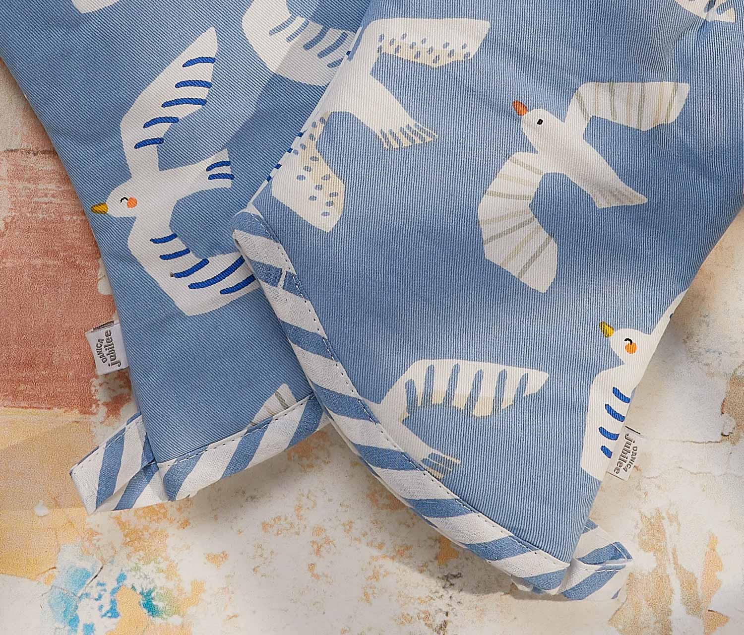 Durability soars with whimsical fun with our set of 3 cotton knit dishcloths by Danica-Jubilee. Easy breezy seaside charm swoops in with these meticulously crafted dishcloths from soft cotton. Part of the Birdie Collection, the design features high-spirited, hand-drawn birds in a mineral blue and golden yellow palette, capturing the joy of flight and fresh air. Perfect for avian lovers, bakers, and anyone drawn to subtle nautical vibes.