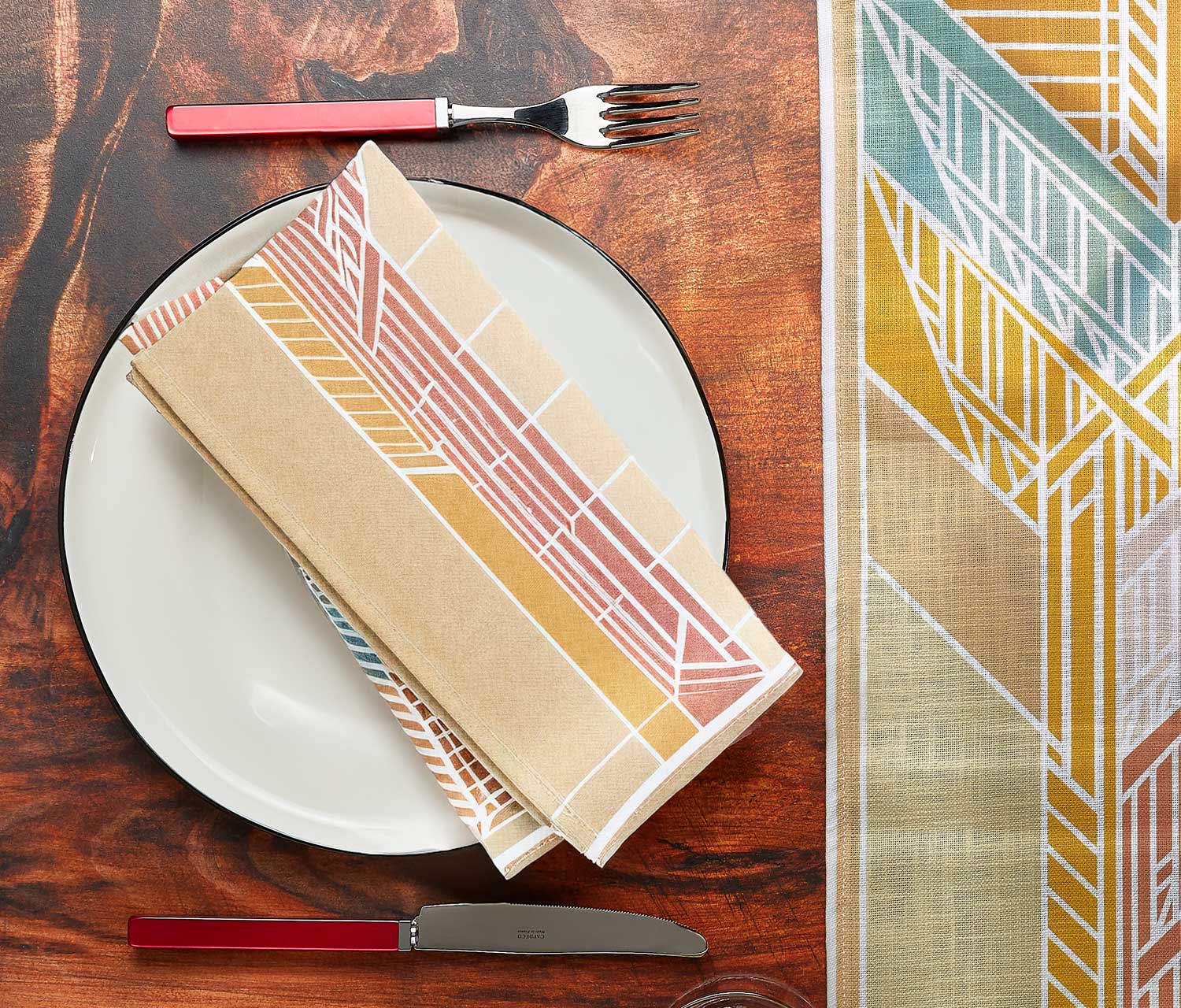 Good design belongs everywhere—even the table. These Frank Lloyd Wright–inspired sturdy cotton printed napkins bring the beloved Mid-Century Modern style to life for every tablescape. Featuring the colorful Dana-Thomas House Sumac pattern in soothing aqua blues, coral, ivory, and warm golden hues, it delivers effortless Mad Men energy with a side of timeless design.