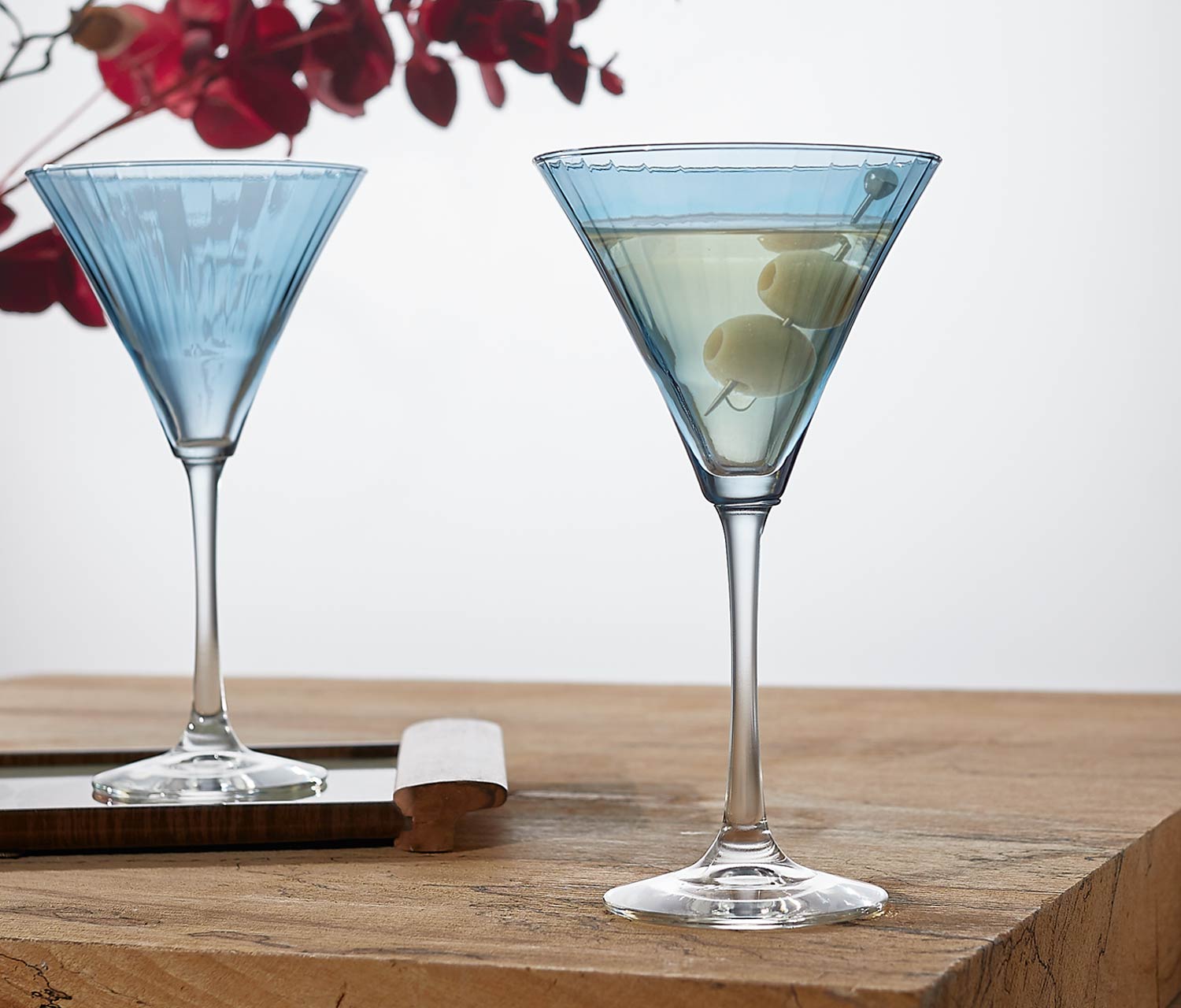 Featuring a stunning transparent blue shade and sleek vertical linear panels, this distinctive glass adds a splash of vintage Old Hollywood charm—ideal for your favorite martini or that memorable celebration toast!