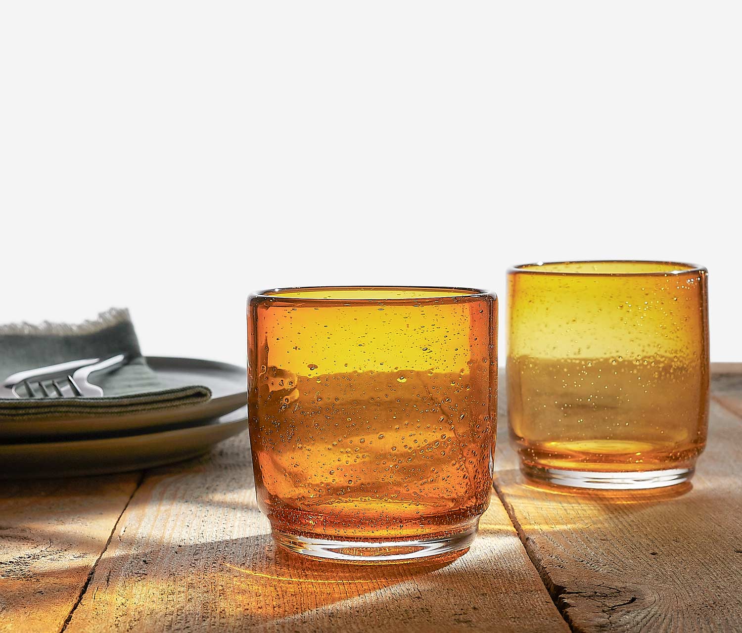 Get ready to bubble over with joy with these Amber hand-blown drinking glasses by Danica Heirloom. Made from soda lime glass, these playful golden hued glasses feature a unique bubble texture that adds a pop of fun to any meal, turning a boring day into a blast!