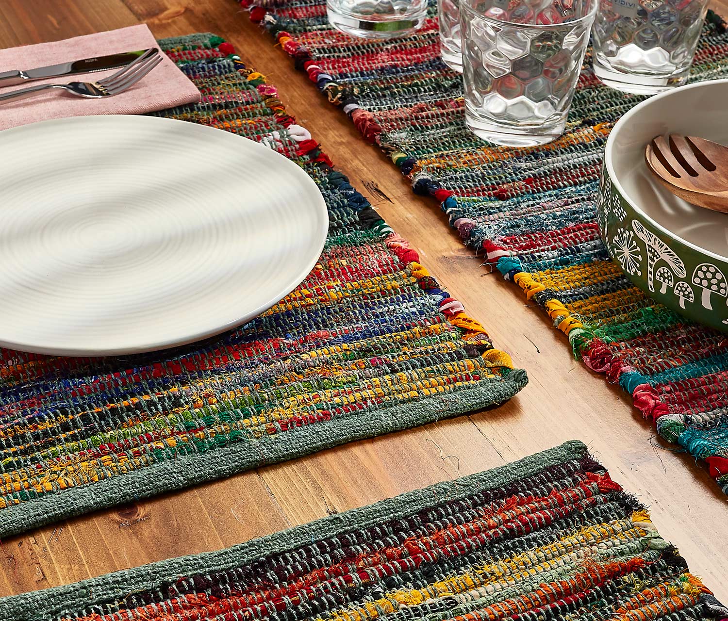 Crafted by hand from recycled sari fabric bursting with rich jade greens, magenta, ochre yellow, terracotta, and hunter greens, each placemat is truly unique.
