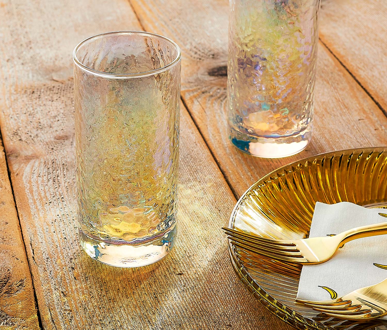 Create a colorful & fun vibe for your table or bar collection with these guaranteed mood booster tall tumbler/drinking glasses...filled with an iridescent shine and hammered texture, these glasses will lift your spirits morning, noon, or night.