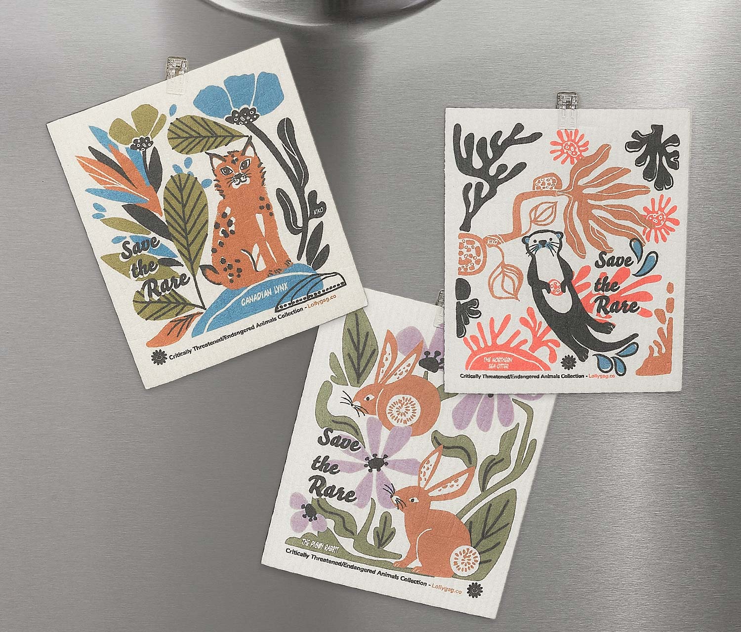 Let nature’s playful wonders wander into your home with our signature PNW Fading Fantastical Wildlife collection—featuring hand-drawn illustrations of the Canadian Lynx, Northern Sea Otter, and Pygmy Rabbit. Each cloth celebrates the beauty of our Pacific Northwest and highlights some of its most critically threatened and endangered furry friends.