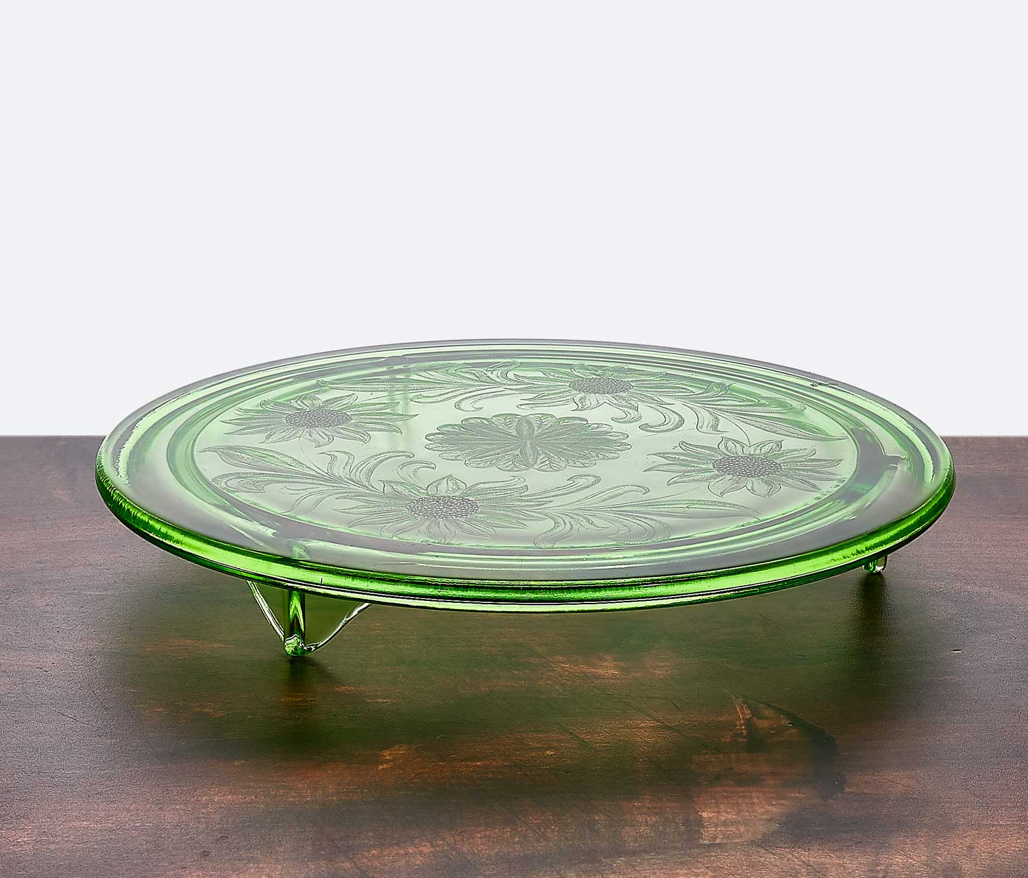 Vintage Jeannette Sunflower Uranium Green Glass Cake Plate