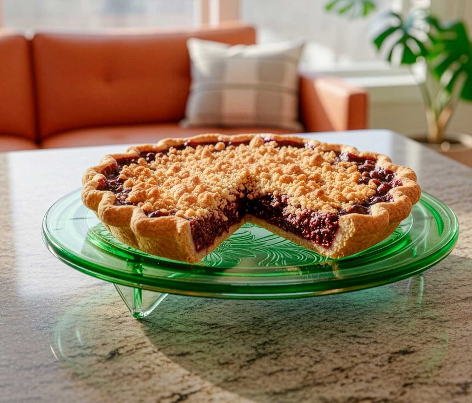 Featuring a sweet etched sunflower pattern and a vibrant celery green hue, this 1930s uranium glass cake stand is a party favorite—and it has a secret talent too: it glows under UV light for a fun, glowing surprise!