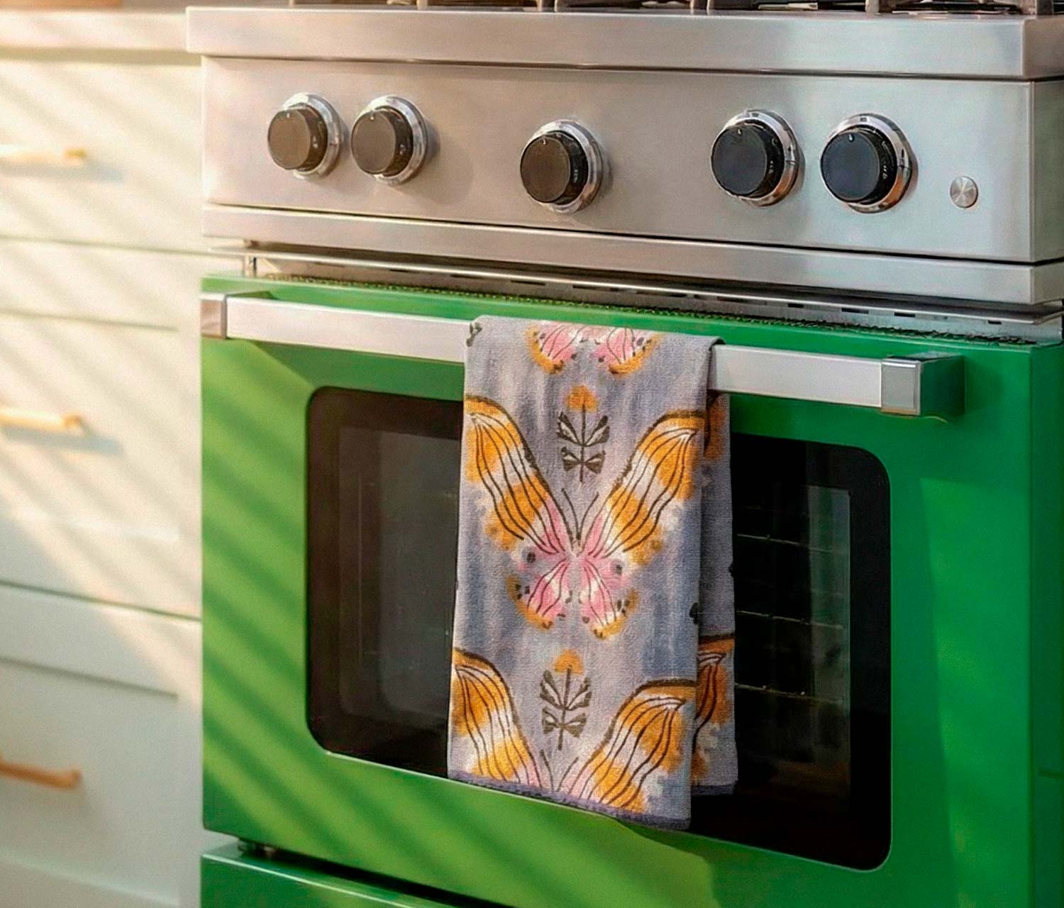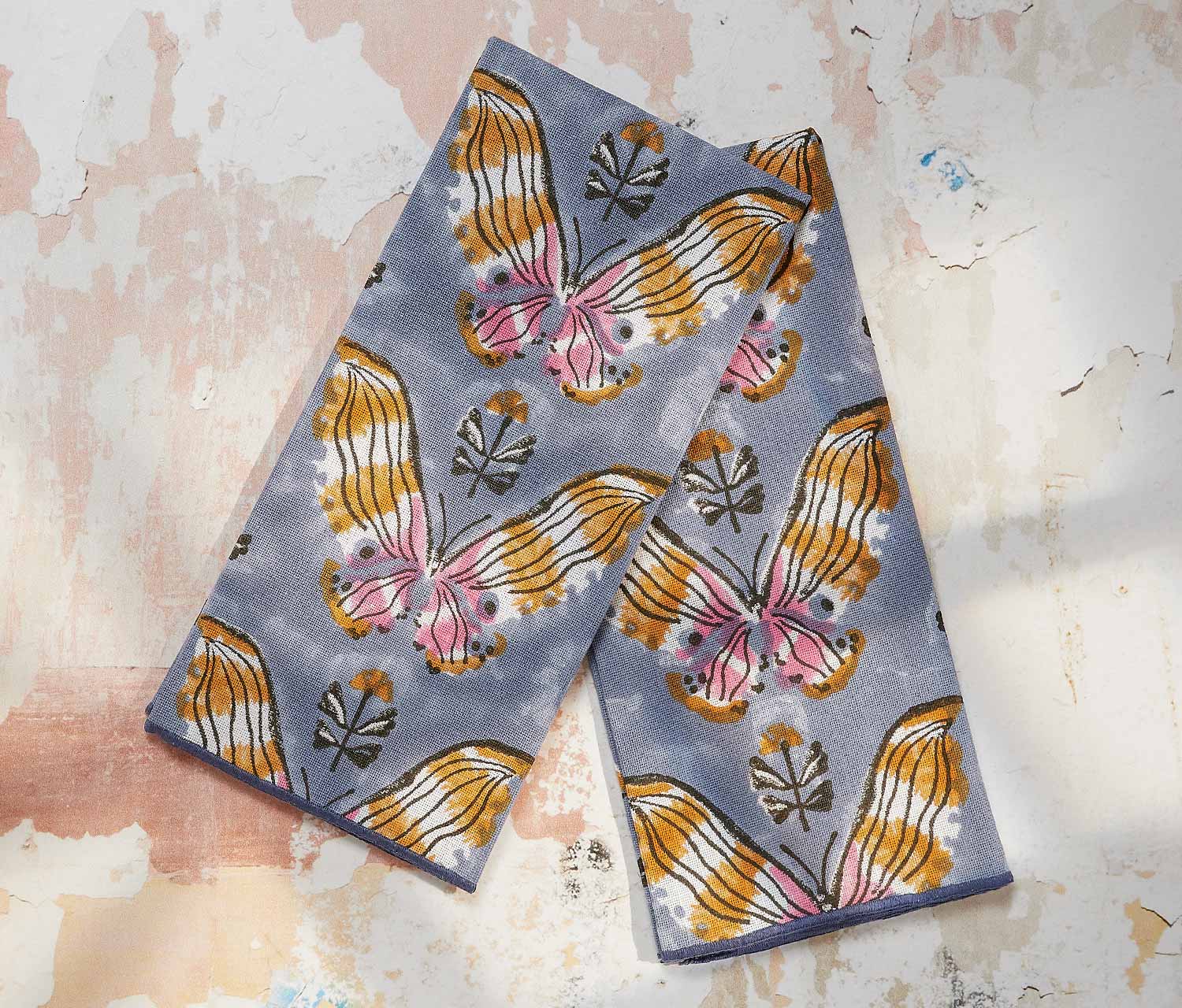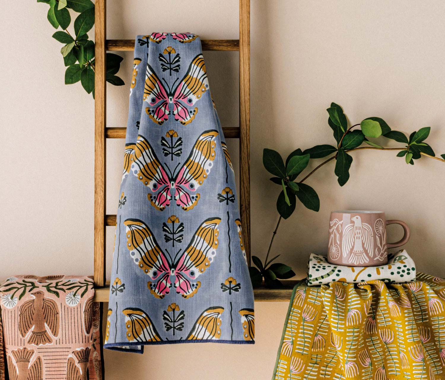 Danica Studio's Aurora dish towels bring whimsy to your kitchen with hand illustrated butterflies dancing across a mineral blue sky, blending artistic charm with everyday practicality.