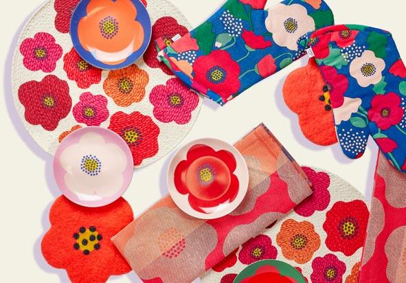 We're blooming with joy and "color me happy" vibes with our new Mid-Mod Poppy collection! Inspired by the groovy iconic flowers of the 60's in bold brilliant hues of reds, oranges, greens, and cobalt blue, this ensemble of round woven placemats, oven mitts , felted trivets, tea towels & dessert/appetizer plates is perfect for any Marimekko or flower power lovers.
