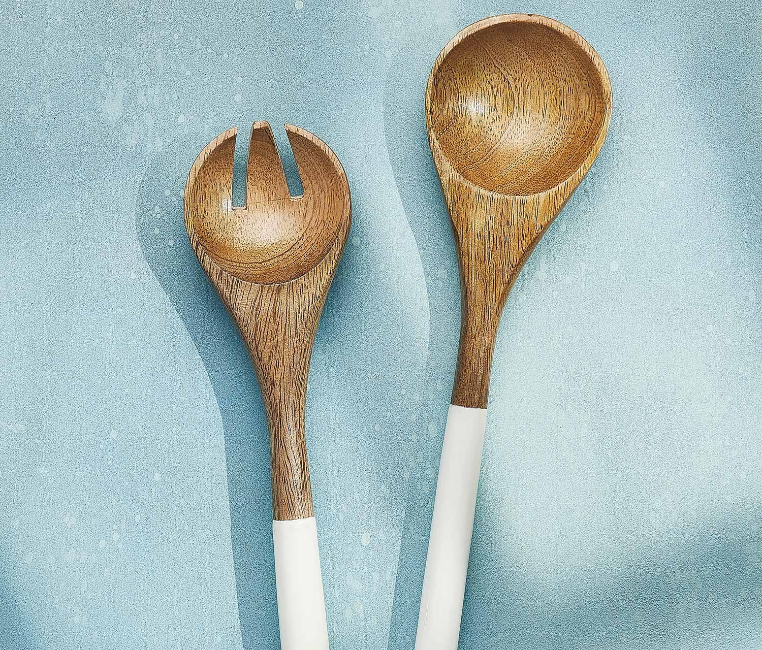 Each piece has an easy-to-hold, ergonomic handle that makes tossing and serving feel natural, while the soft ivory finish lets the wood grain shine through for a warm, earthy look that fits right into any kitchen.