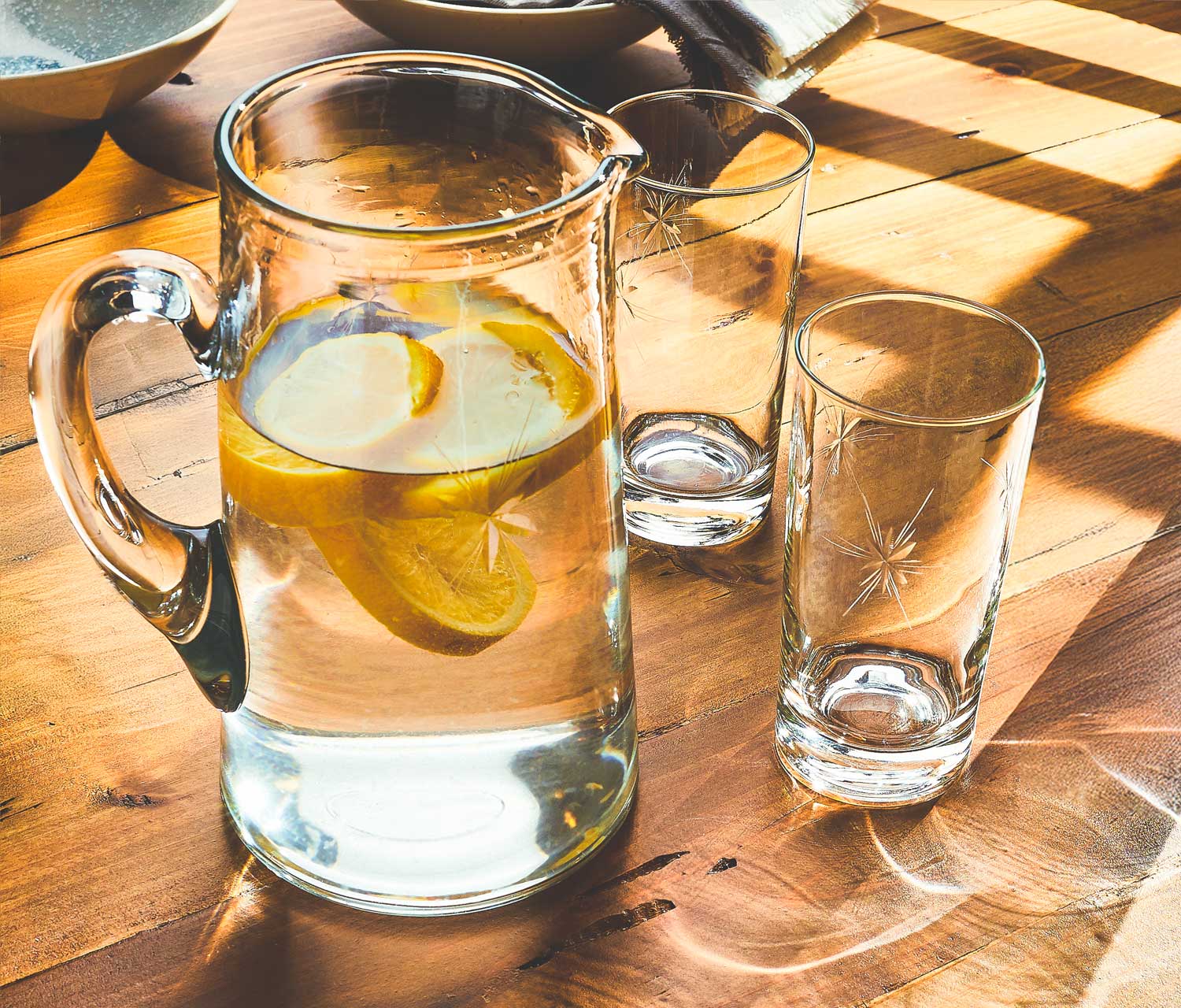 Perfect for cocktails, mocktails, lemonades, or your favorite chilled drinks, this set combines playful retro style with practical function. The glasses hold 12 oz each, while the pitcher holds 50 oz. Hand wash recommended to preserve the vintage etching.