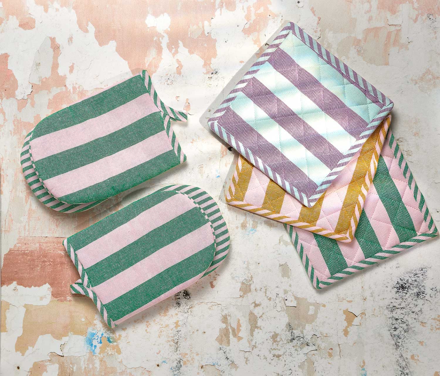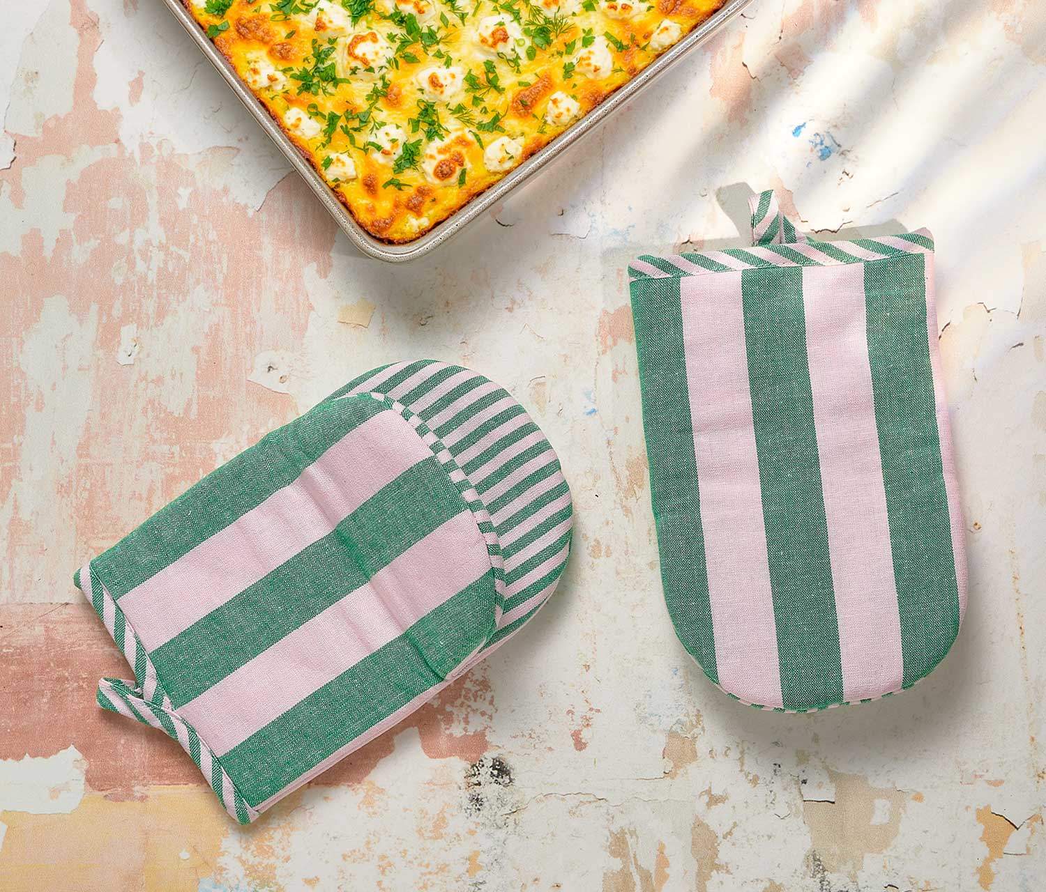 Meet your new kitchen crush: our Saltwater Taffy Stripe Cotton Mini Oven Mitts. This set of two brings the candy shop vibes straight to your stovetop—no sticky fingers required.