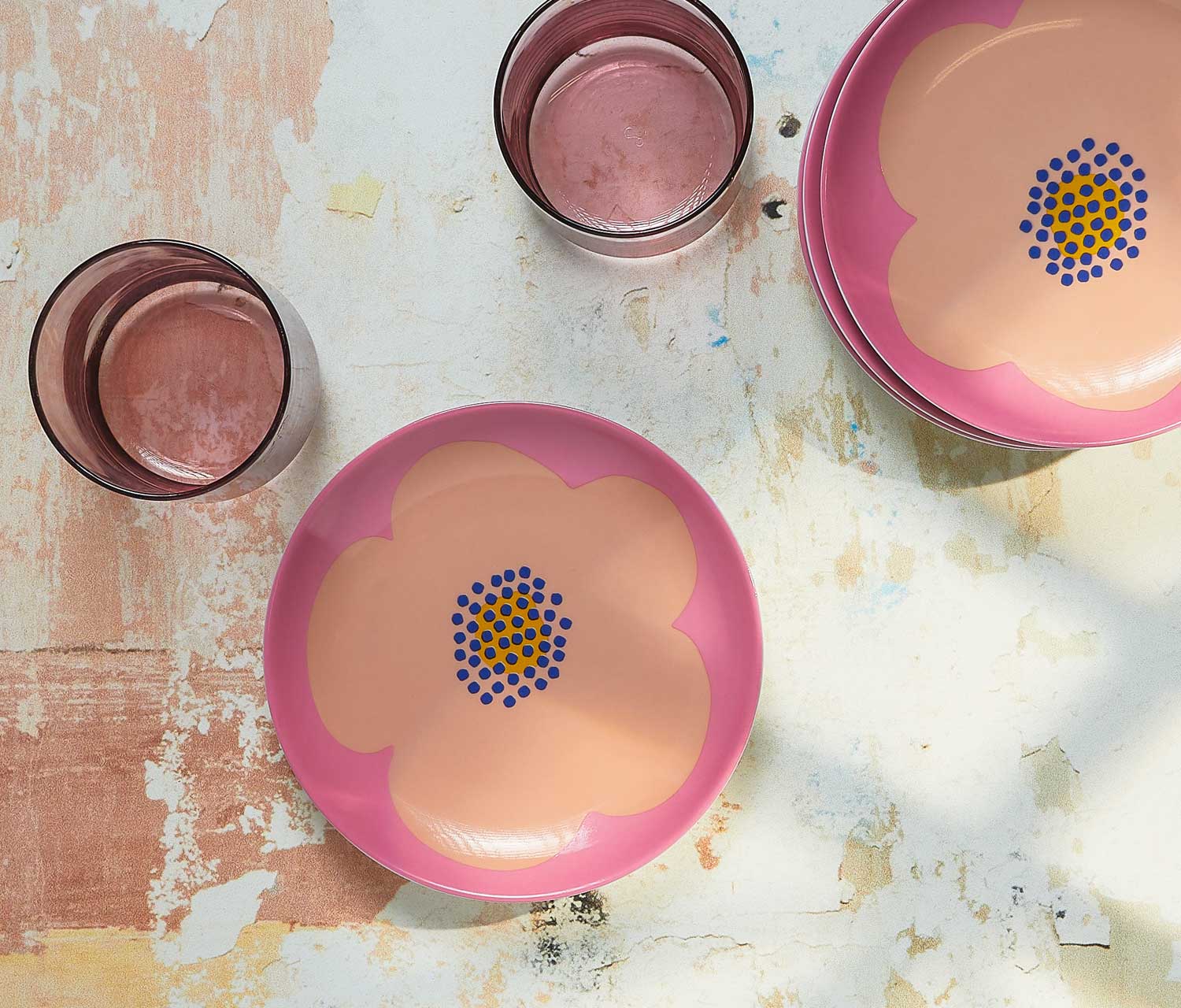 Each plate sports a bold retro-inspired oversized poppy reminiscent of the iconic '60s and '70s floral Marimekko designs in vibrant petal pink. Perfect for serving your fave "groovy" snacks, apps, or desserts and a great gift for any retro lovers & modern art enthusiasts!