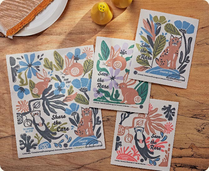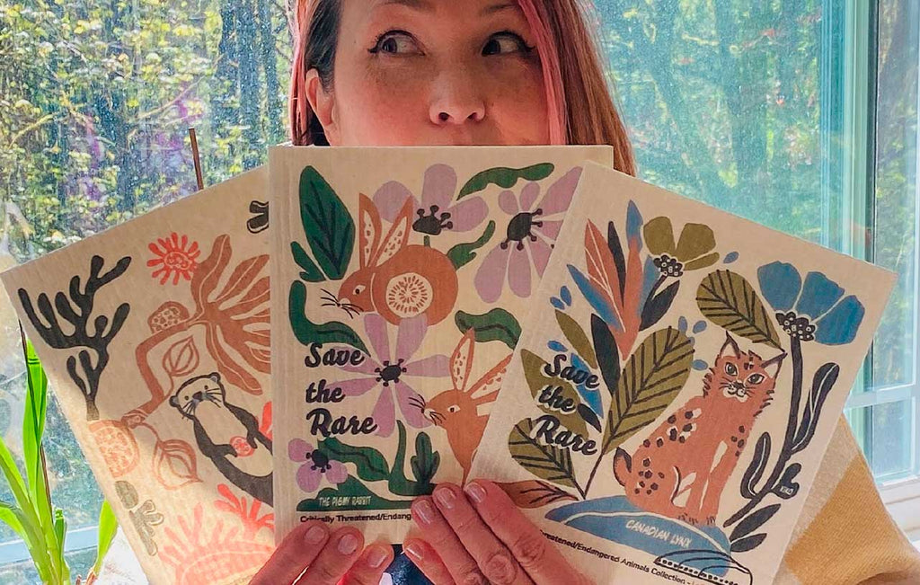 We’re excited to introduce our first Greenhearted collection: The Fading Fantastical Wildlife. This set includes hand-illustrated, eco-friendly Swedish dishcloths and dry mats featuring three endangered or threatened animals from the Pacific Northwest—the Pygmy Rabbit, Canadian Lynx, and the Northern Sea Otter.