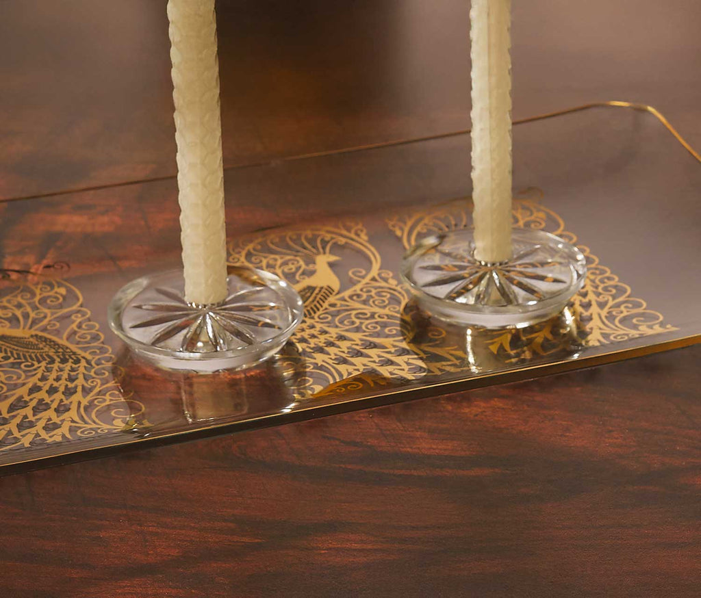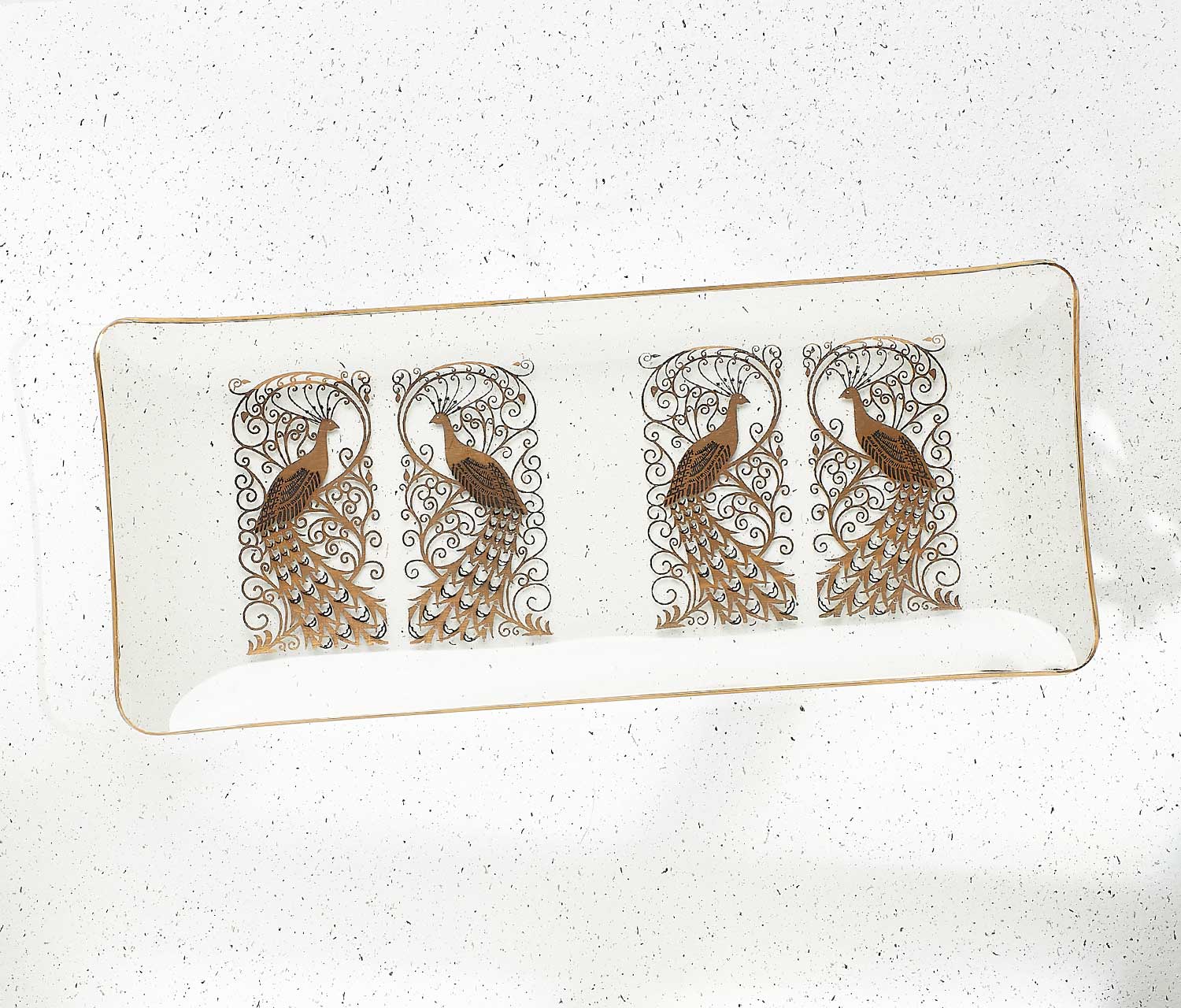 Beautifully adorned with four 24K gold painted signature peacocks, this tray is great for serving your favorite treats, finger foods or desserts in total "Mad Men" style!