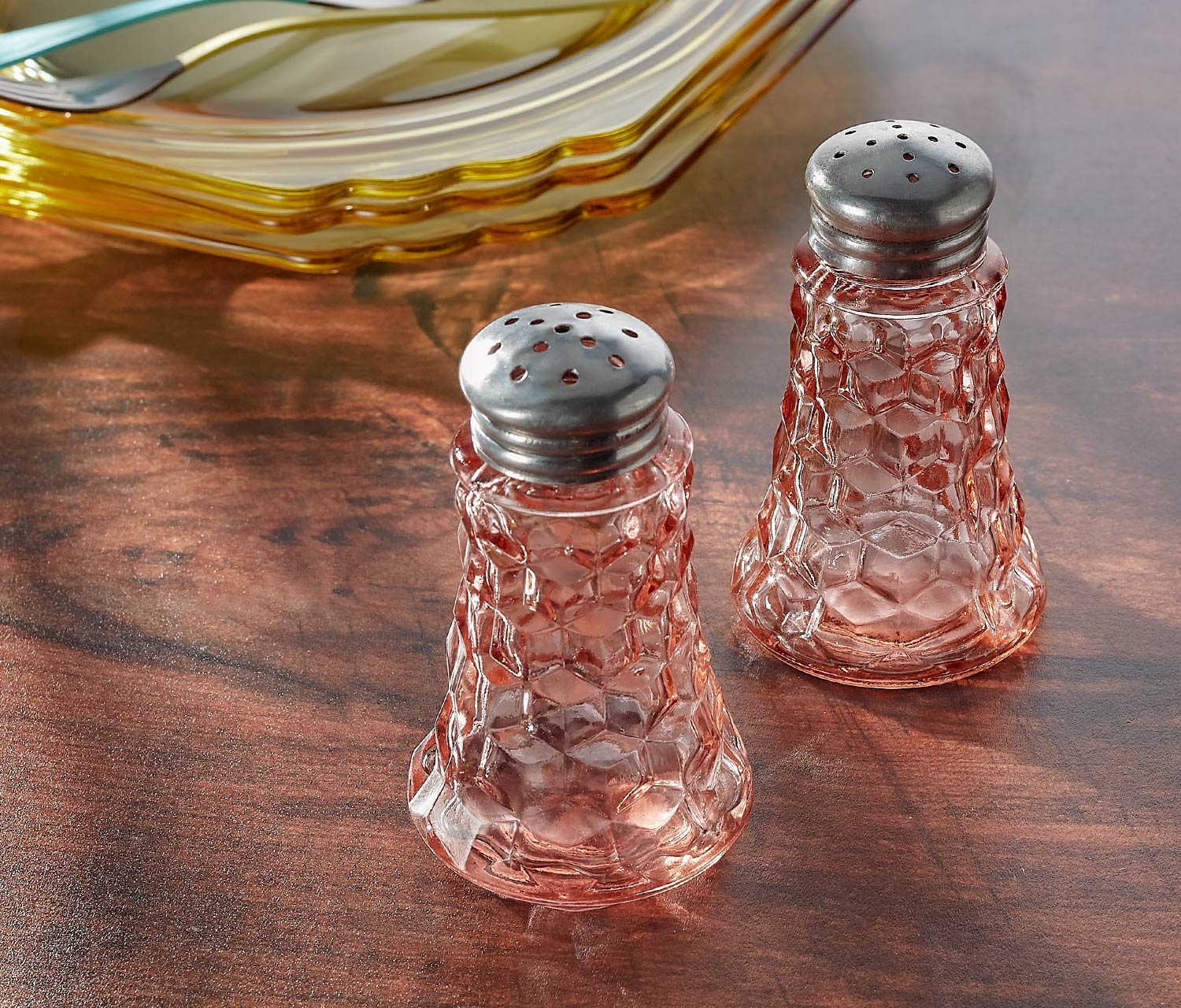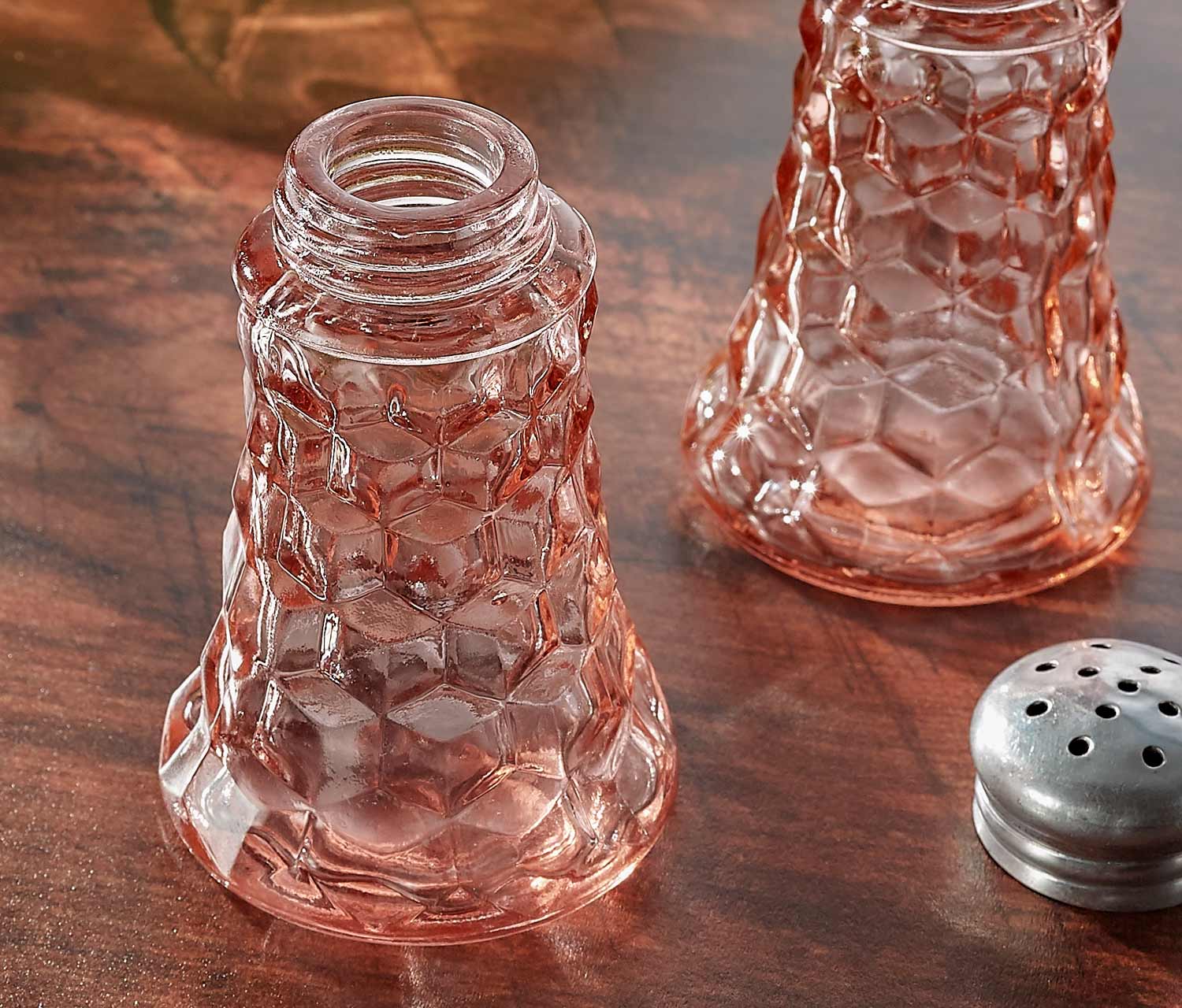 Material: Depression Glass-pressed/ aluminum tops