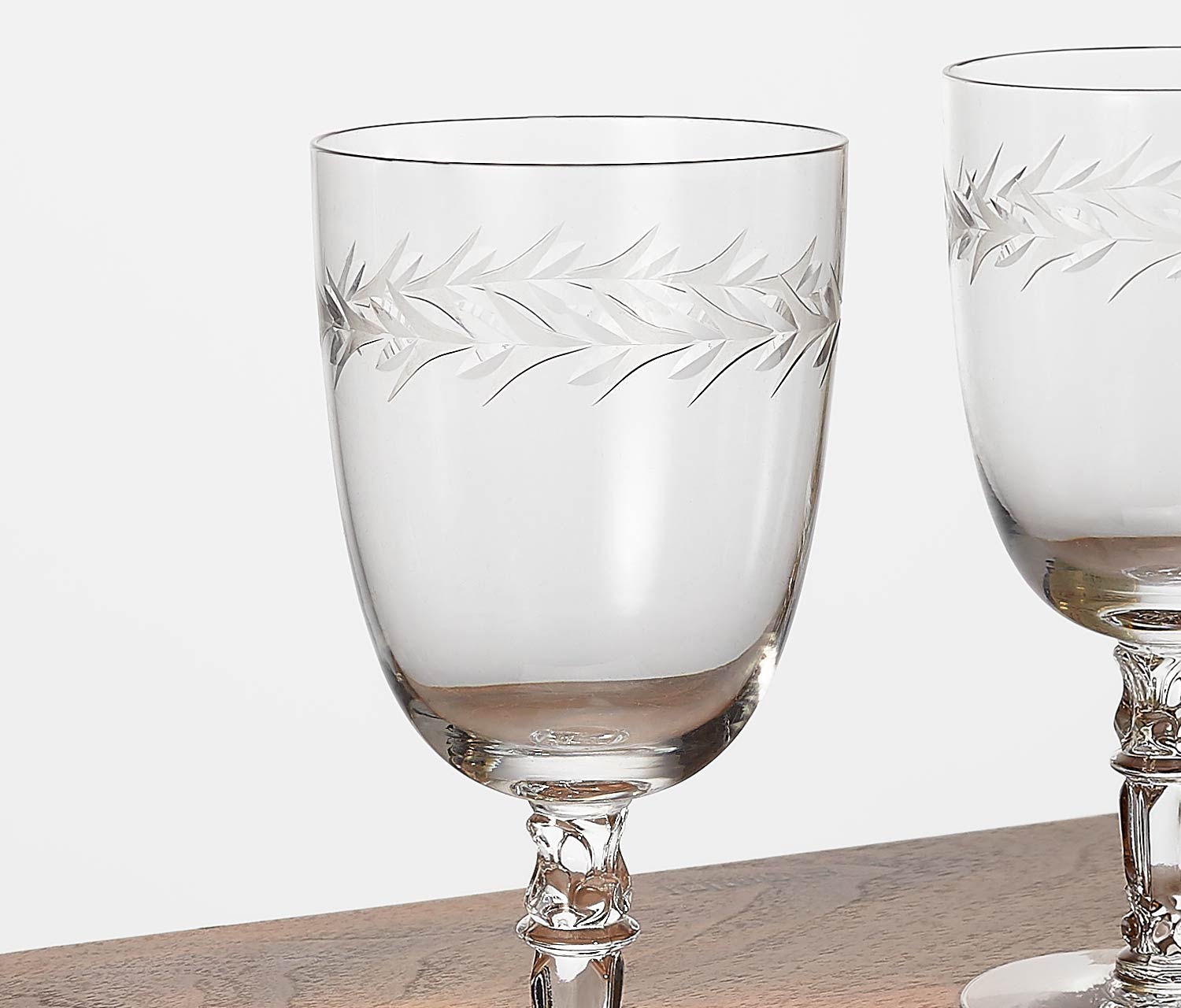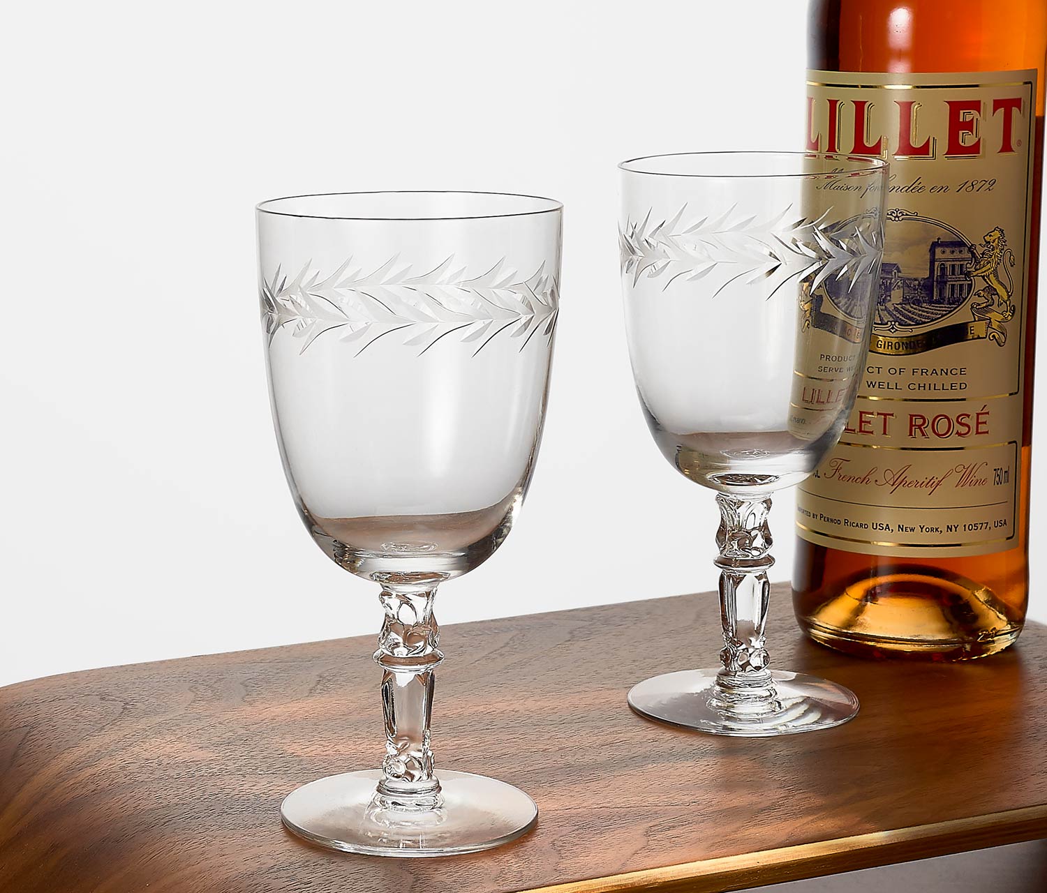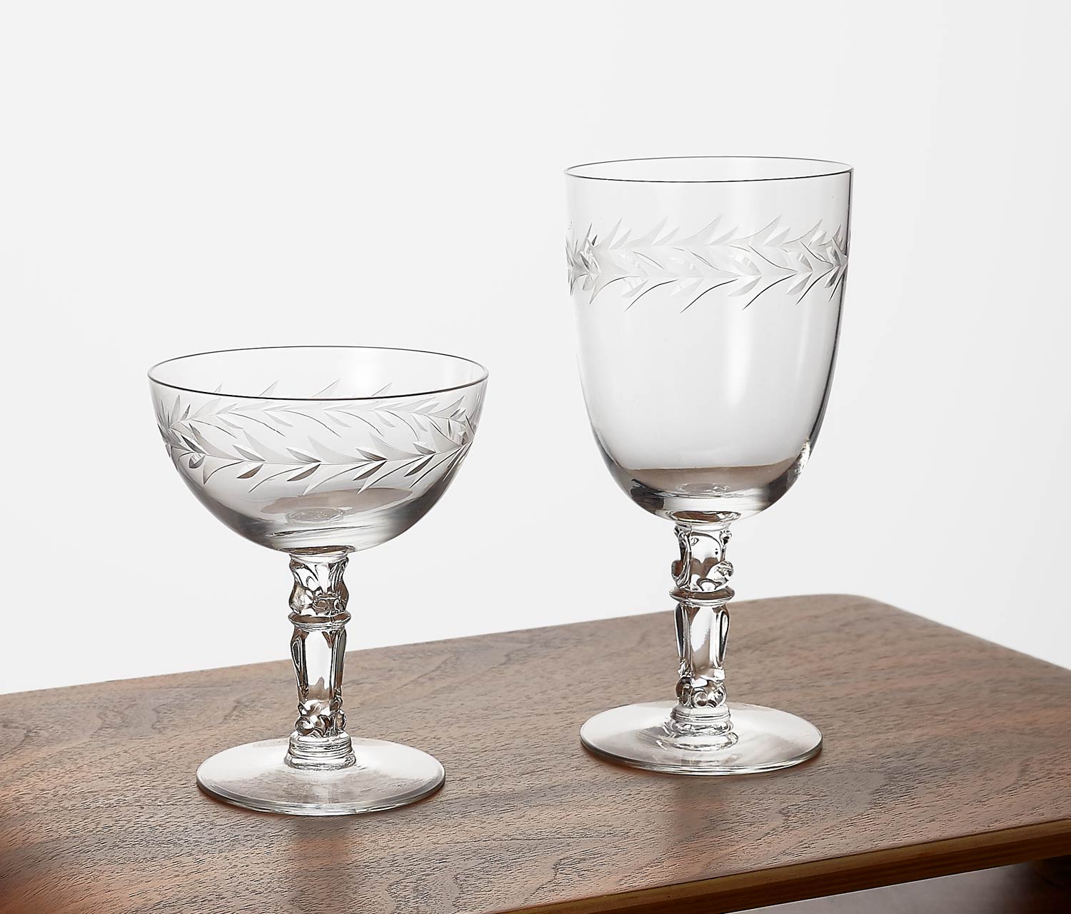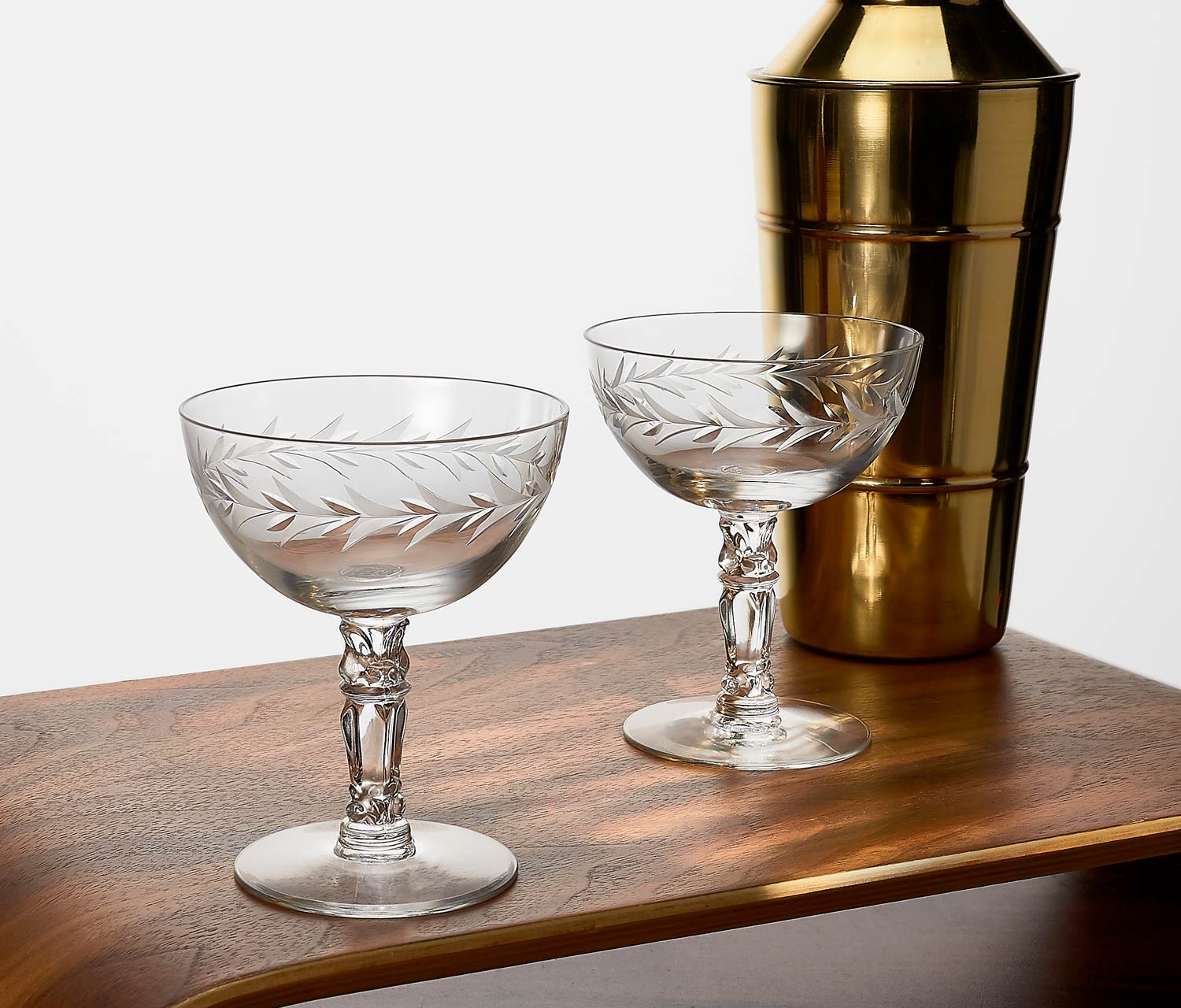These 8 oz. 1940-50's laurel cut pattern glasses have a sculptured stem and etched geometric leaves around the rim giving them a unique look perfect for sipping the night away with your favorite wines or beverages.
