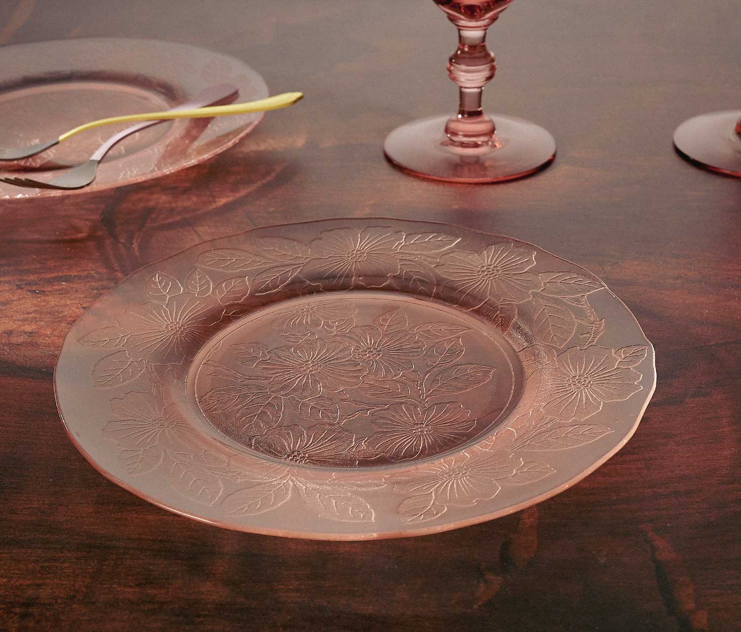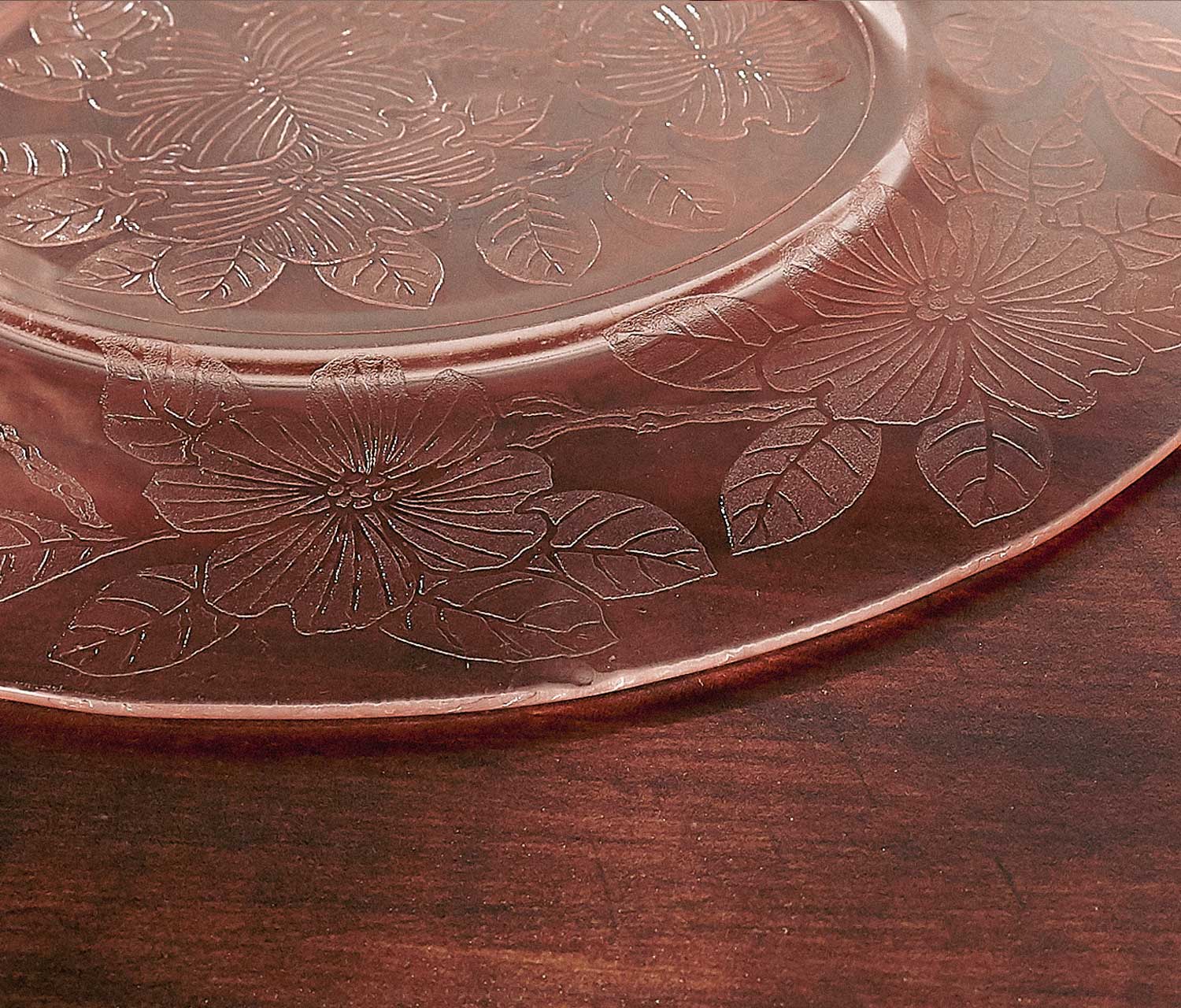 Everything is coming up roses or "Dogwood" with these beautiful vintage pink depression glass plates by MacBeth Evans Glass Co.