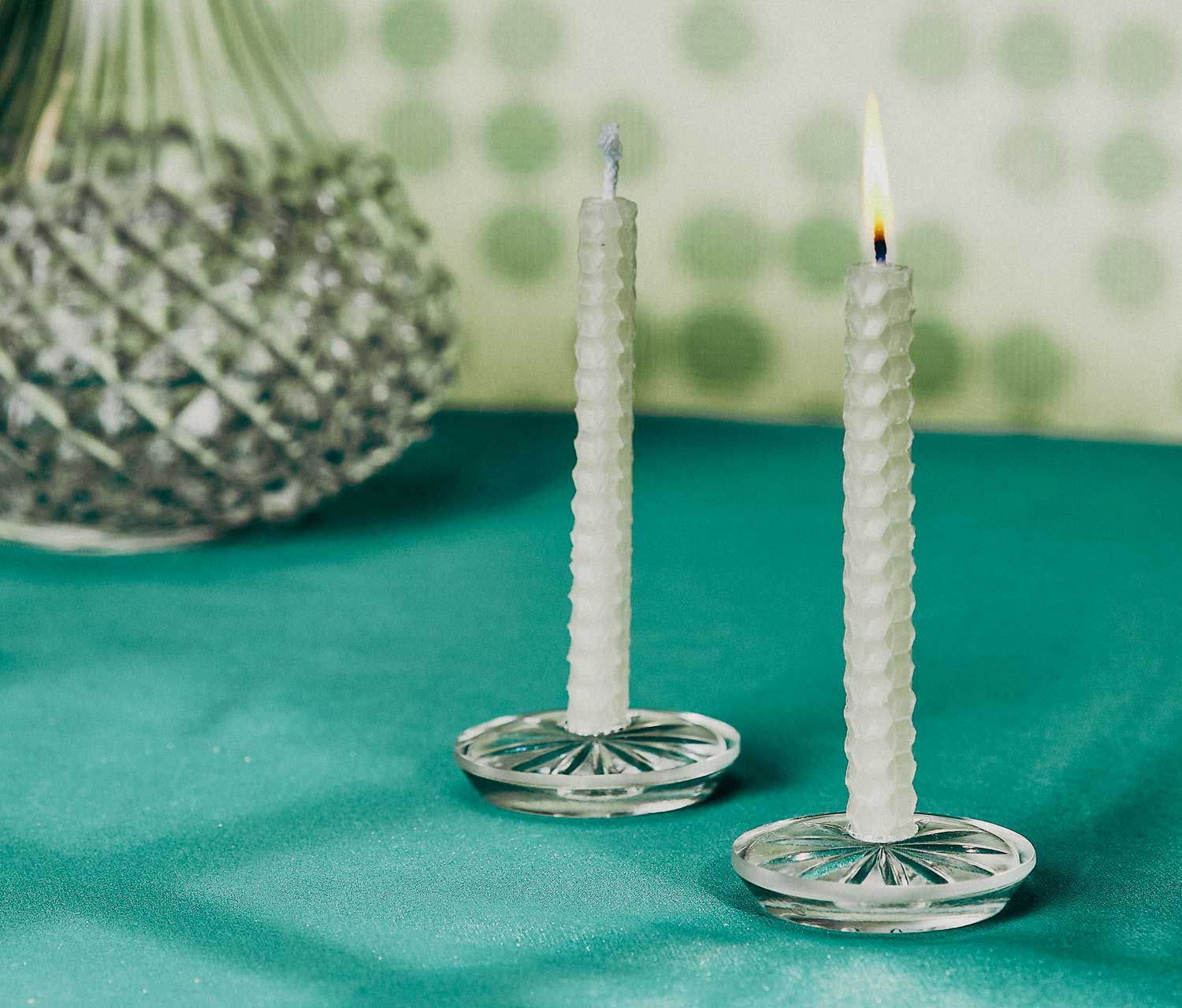 Add a pop of Mid-Century style to your next romantic dinner or family celebration with these rare 1970's cut crystal starburst candle set- including 6 candle holders & 6 small beeswax taper candles.